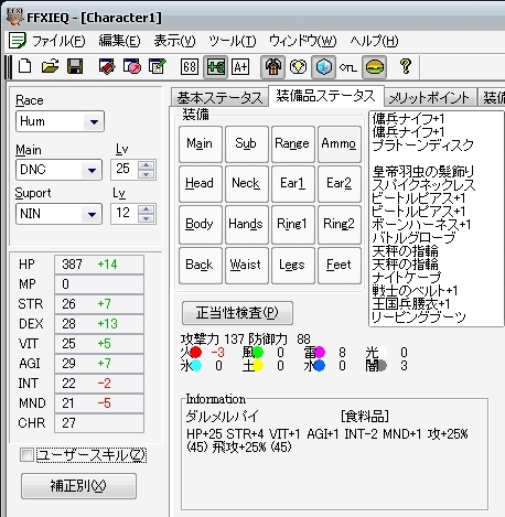 ようやく重い腰をあげて進めることに。 写真とったはずがまったく保存されてなかったので、 ログというか記憶のみです(笑 ジョブは 踊子/忍 Lv25 装備は↓の通り Lv上げ時となんも変わりませんw その他の所持アイテムは イカロス 1個 聖水 1D ハイポ 10個 ペア・オレ 1個 スキッドスシ 1個 開幕でイカとペアオレと空蝉。 その後目玉に向かってドレインサンバ 蝉はすぐ剥がれますが、張りなおしは危険なので放置。 ハイポで回復します。 注意するのは目玉のアイズオンミーと石化です。 片方はHPさえ保ってれば平気ですが、石化は視線判定なので うしろを向けるようにオートロックは解除しておいた方が吉。 (おかげで1回逝っちゃいましたw) 目玉さえ乗り切れば、ドラゴンと1VS1。 上記の装備でそこそこ避けてたので、きちんと蝉張替えしてれば問題なし。 呪いがきたら、そっこーで聖水使って、ケアルサンバ連打。 運が悪いとWS全部が呪いの可能性もあるので聖水は複数あったほうが良いと思います。 こんな感じでやってれば簡単にクリア出来ちゃいますよ。 挑戦する人がいればぜひ頑張ってみてください('∇') PR 2009.02.21 Sat 18:00:08 第1回チョコボ輸送-21.02.212009.02.20 Fri 13:31:18 踊り子Lv27〜28 |